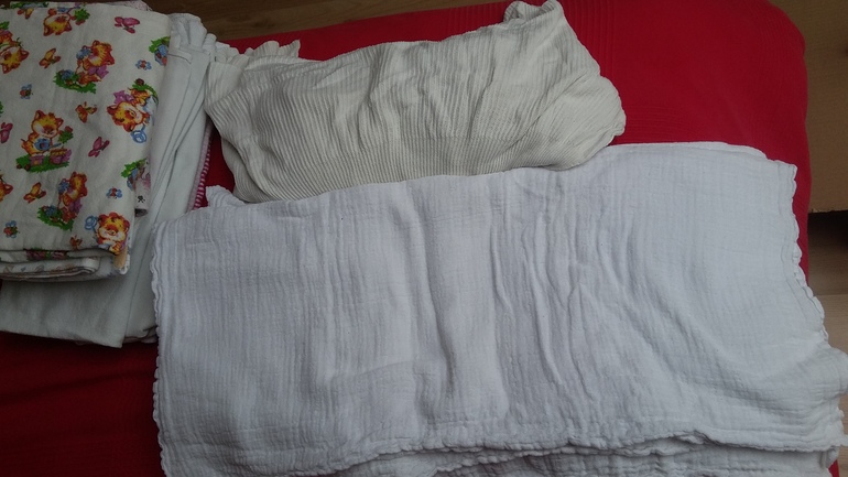 Начала я собирать набор с того, что увидела в местной группе 'отдам марлевые пеленки, около 10 штук'. Я вызвалась оплатить пересылку и получила 18(!) белых муслиновых пелёнок, дома у меня ещё 4 шт неотбеленных нашлось.