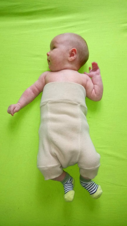 Самыми первыми мы носили штанишки wisemam в размере s, но подсаженные в машинке и фактически размер xs получился, и штанишки naturlife. Как они сидят на новорождённой, я показывала здесь.