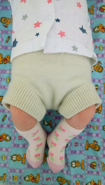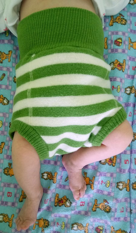 Первыми мне попались штанишки babyidea в размере m. Взяла я их на авито с рук вместес тренировочными шторхами. Достав их, я расстроилась, потому что обнаружила пятна, вероятно, от ланолина. Потом по следам недавнего поста от Ольги решила покрасить их сначала чаем, а потом кофе с корицей. Штаны не сильно потемнели, пятна полностью не перекрылись, но вид стал однозначно лучше. Сначала они меня как-то не впечатлили, но померив их на дочь, решила оставить: всё же размах в размере у них большой. Любви к ним пока не питаю, особенно раздражают швы на спинке и бирка - ну очень толсто:( Но сидят хорошо. Посмотрите сами:)