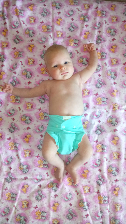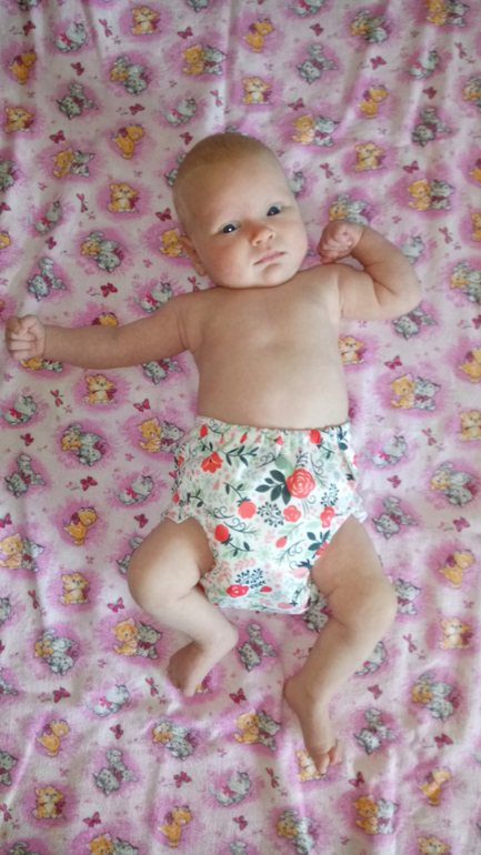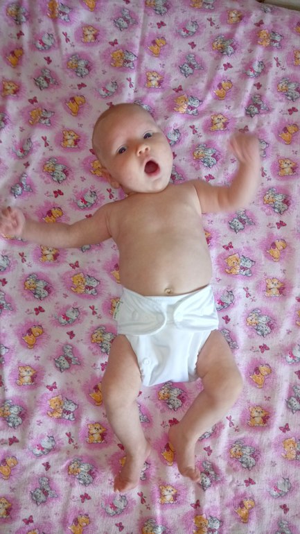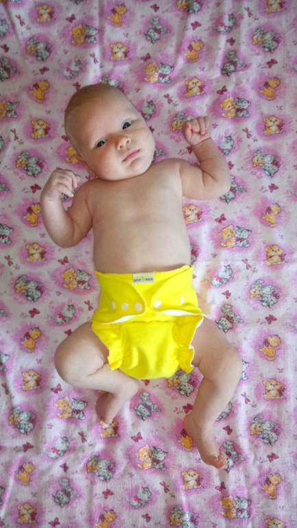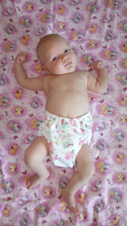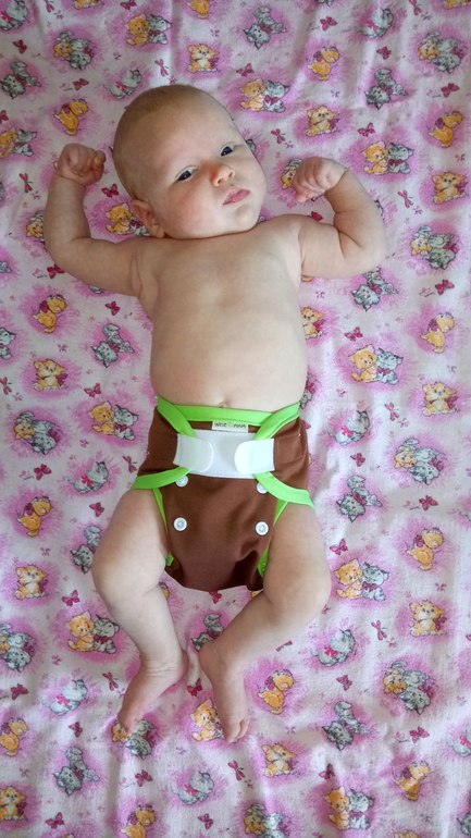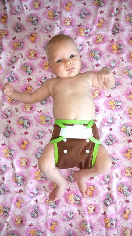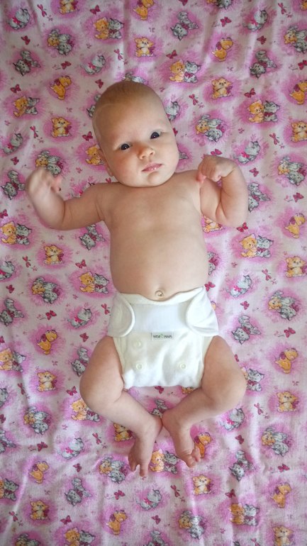 В ней два подгузника для новорожденных на кнопках, один - на липучках (новинка), подгузник всё в дном для новорожденных (новинка), обложка для новорожденных (новинка) с муслином "птичий глаз" и 5 вкладышами соя/стей-драй, двое трусиков на боковых на вырост и вкладыши для груди для меня:) А теперь фото на дочери и мои впечатления:)