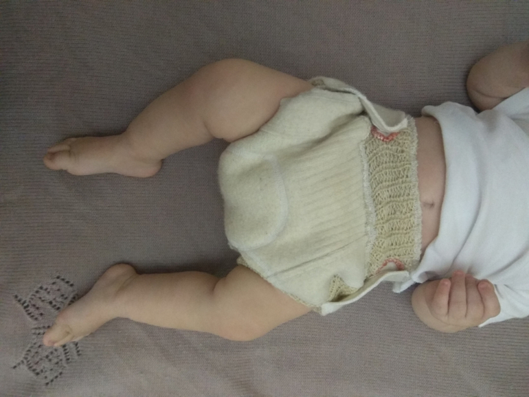 3. Вязаная пеленка из шерсти мериноса, вязкой "эластичная резинка", в качестве манжет для плотного прилегания по ножкам. В прошлом это был снуд из шерсти мериноса,- моя первая работа спицами.