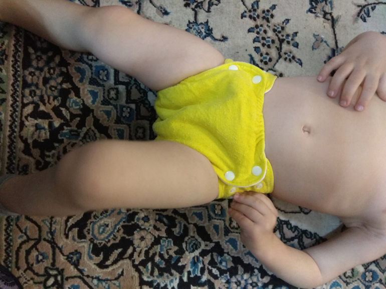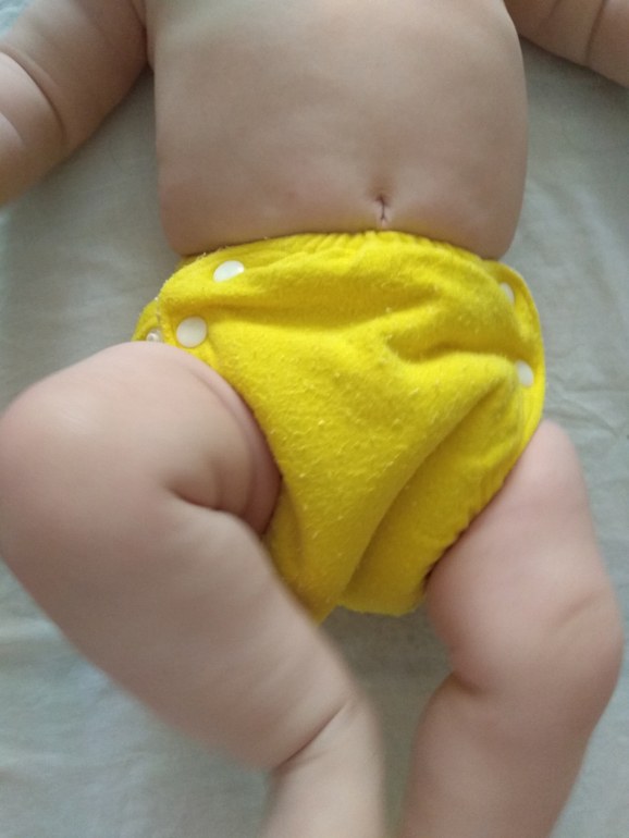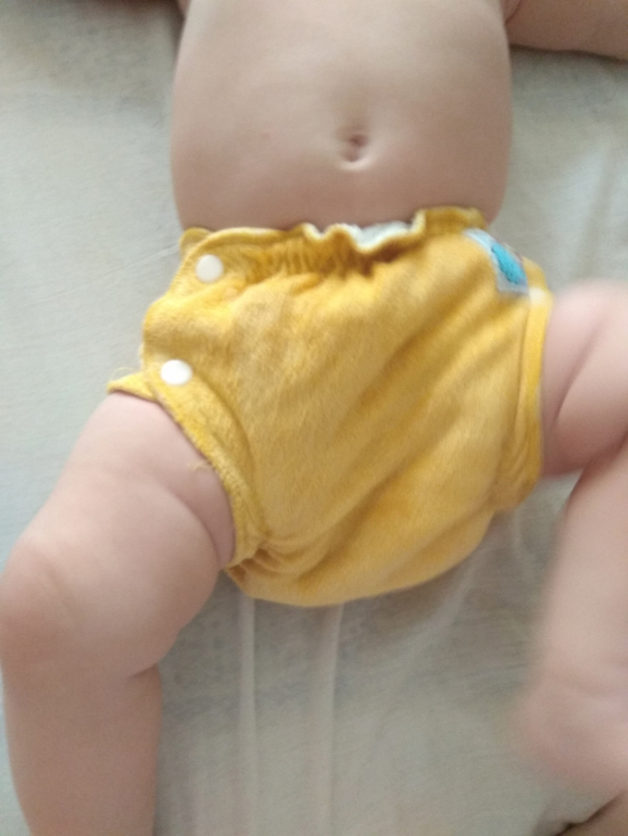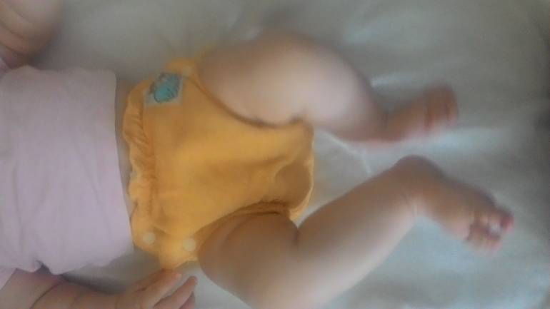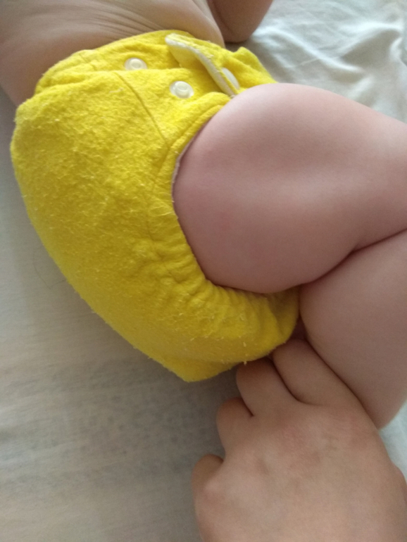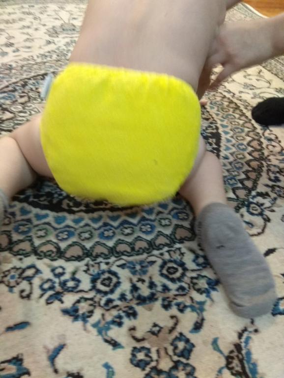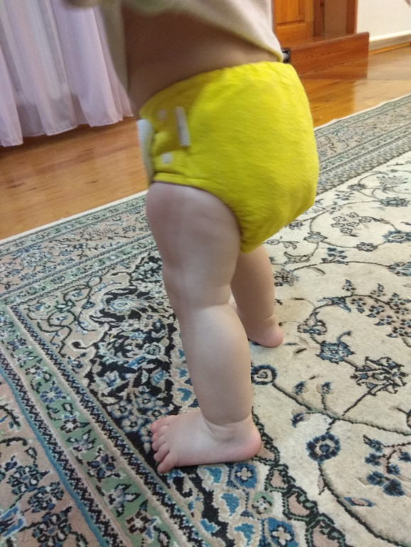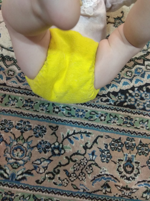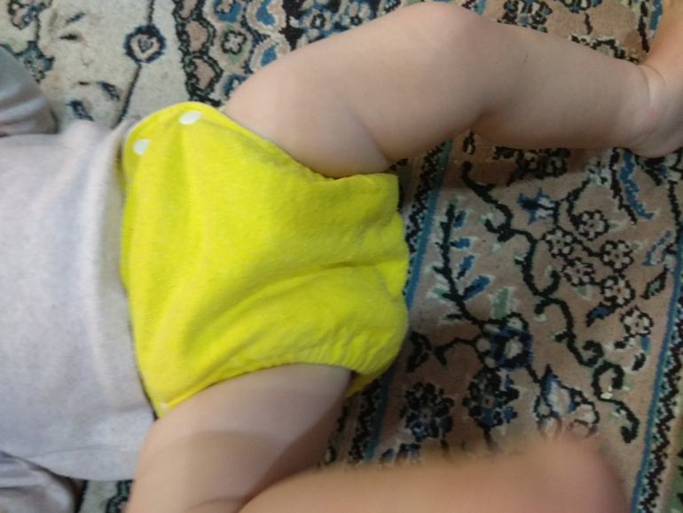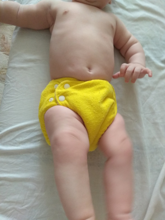А так как я мечтала об аналоге Sandys, и на тот момент у меня была парочка в размере S, я сделала сравнительные фото посадки подгузника на боковых в жёлтом трикотаже от Wisemam и желтая махра на боовыхб Sandys. На фото малышке около полугода: