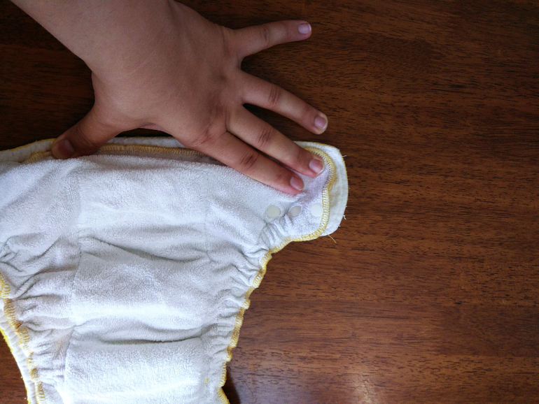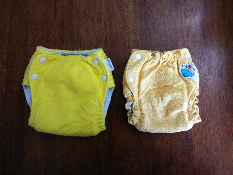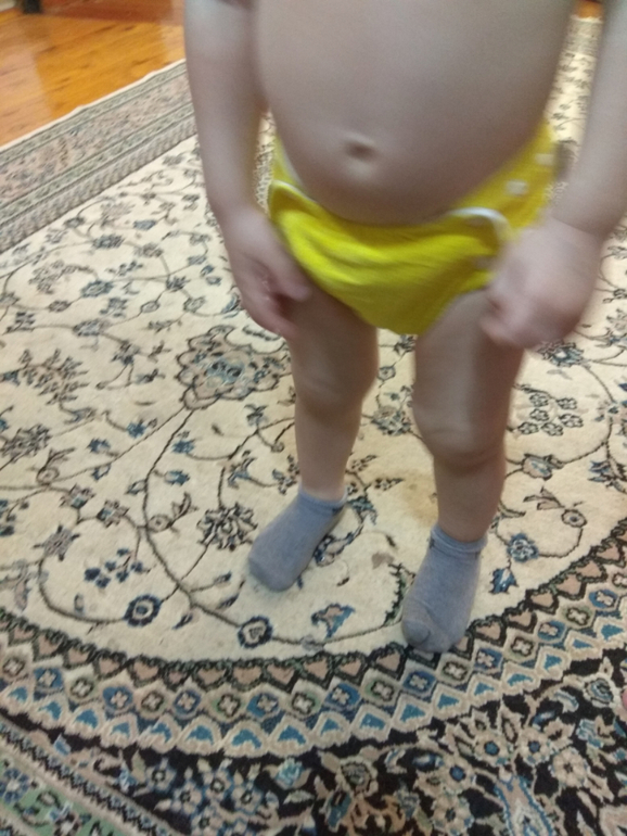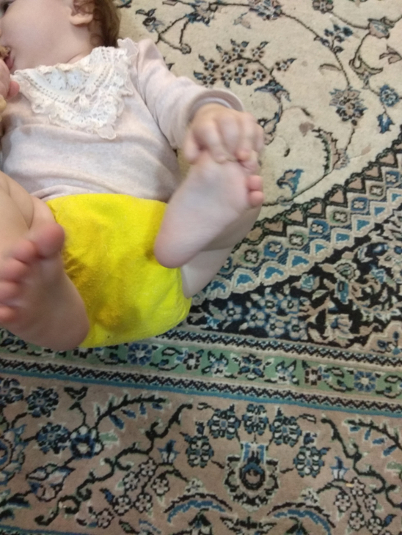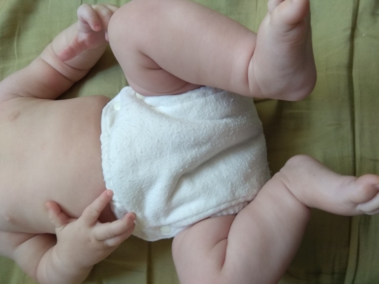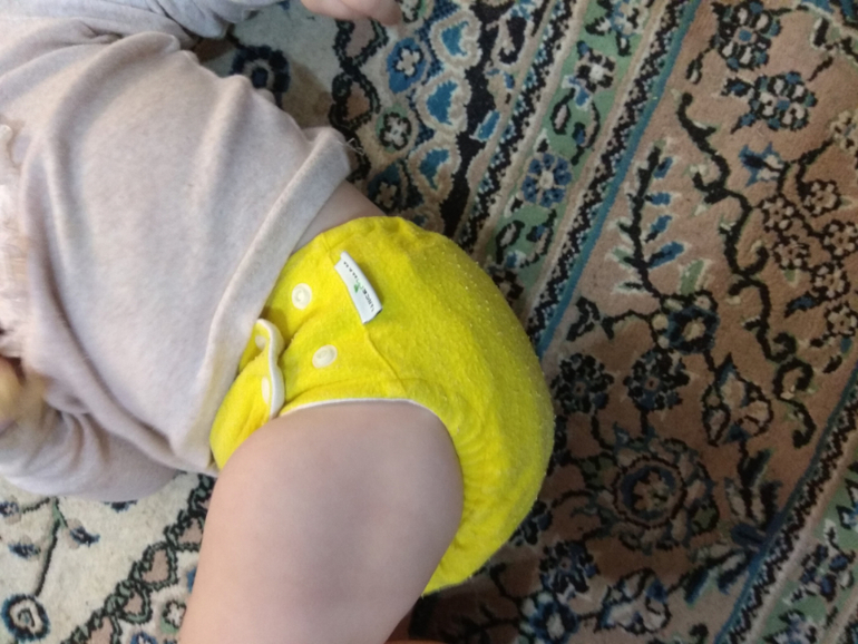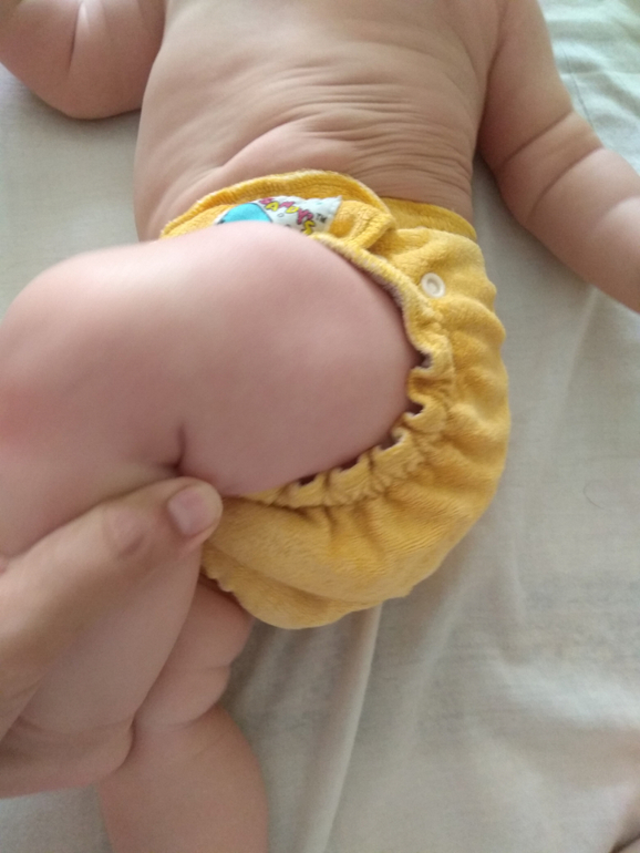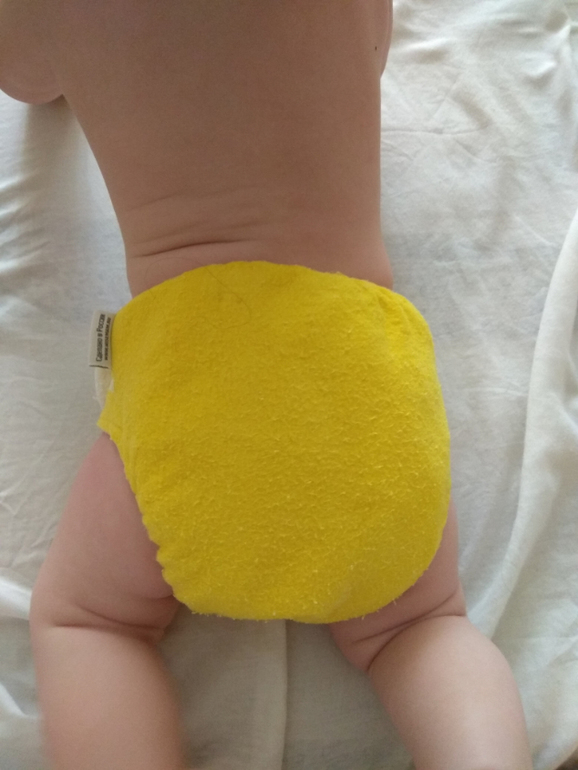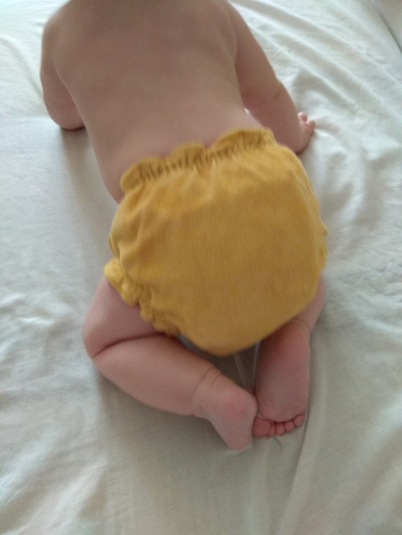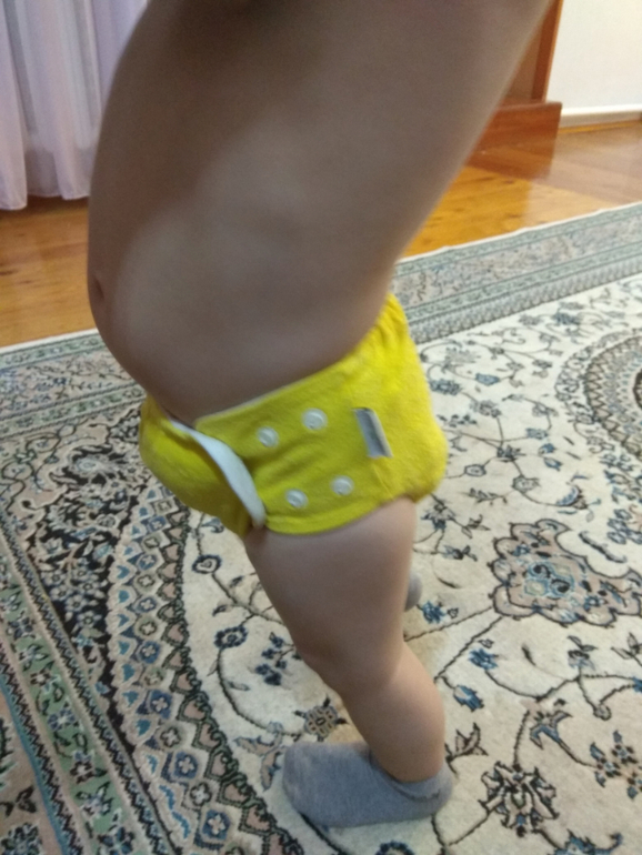 А так как я мечтала об аналоге Sandys, и на тот момент у меня была парочка в размере S, я сделала сравнительные фото посадки подгузника на боковых в жёлтом трикотаже от Wisemam и желтая махра на боовыхб Sandys. На фото малышке около полугода: