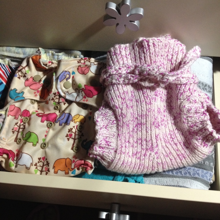 К рождению дочи я нашила столько подгузов, что бы не думать: "а хватит ли на завтра?". Были со вшитым вкладышем, с кармашком, непромокаемые, на завядках -разные. Еще остались подгузы после сына. Это была здоровенная стопка)))) Я их так и не сосчитала. Связала шерстяные штанишки и шерстяную обложку на завязках.