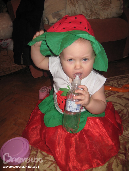 Костюмчик Клубнички очень классненький, мы с мужем умилялись, какая милая у нас доча!)))(шапки не любим, поэтому спазу снимаем!!!