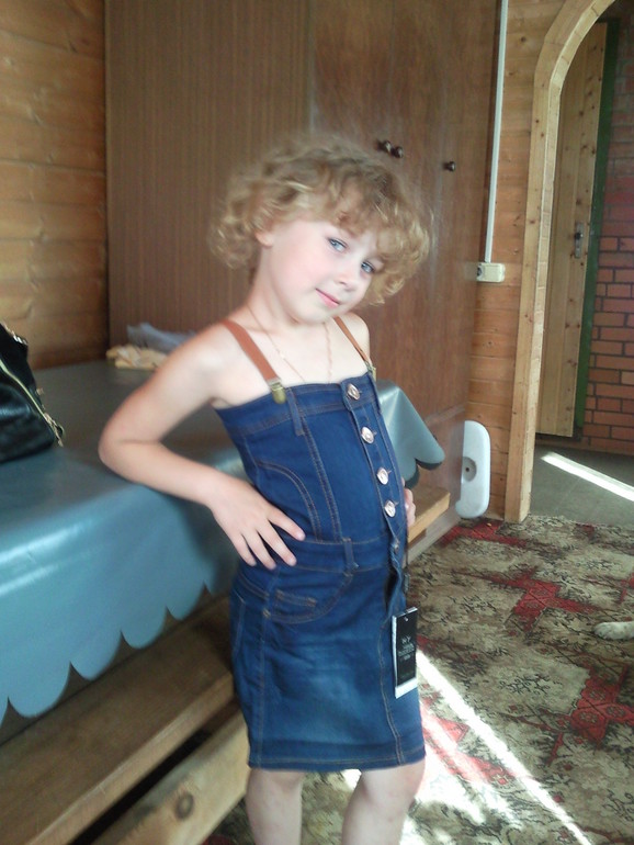 От джинсового сарафана я сама в восторге! Жаль,что нам еще самый маленький размер велик((( можно и блузочку,можно и тонкую трикотажную кофтюлю под него....модель у тебя знаааатная));)))))