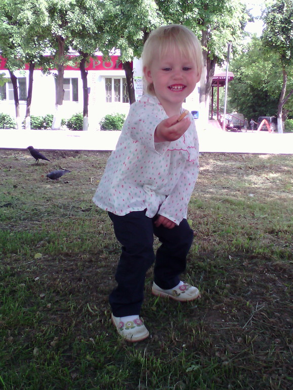 Малая категорически не любит фотографироваться. А тут поймала, вроде ни чего, с улыбкой( для нас редкость). А эта засранка умудрилась схватить бычок, не видела что валялся. Может кто хэй ту гадость убрать и заменить например на цветочек?