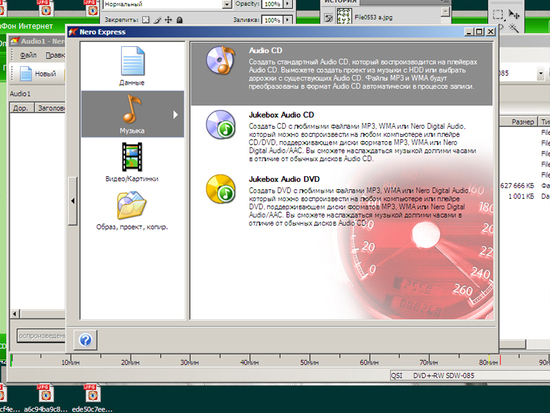 Запускаем программу, выбираем тип диска (СД или ДВД), выбираем нужный пункт, в данном случае - Сделать Аудио СД: