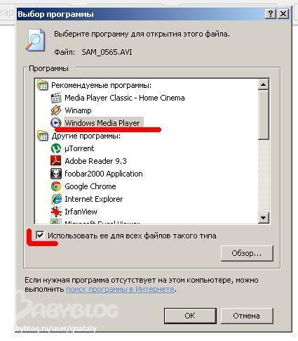 ОТкрыть с помощью - Выбрать программу... (Далее выбираем программу, в нашем случае Виндовс Медиаплеер, и проверяем что бы стояла галочка использовать выбранную проргамму для всех типов файла) и все.
