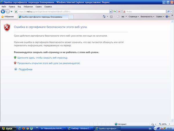 а теперь у меня еще пишет: истек срок действия сертификата безопасности и не пускает в мейл. Даже в Эксплоере, ниже сник есть