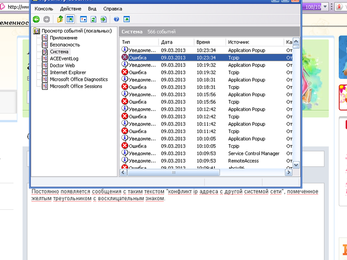 Вирусы, спам и прочая гадостьПостоянно появляется сообщения с таким текстом "конфликт ip адреса с другой системой сети", помеченное желтым треугольником с восклицательным знаком. В "системе" имеются такие ошибки, при нажатии на которые появляется такой текст: