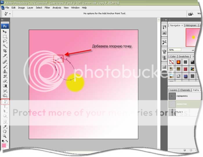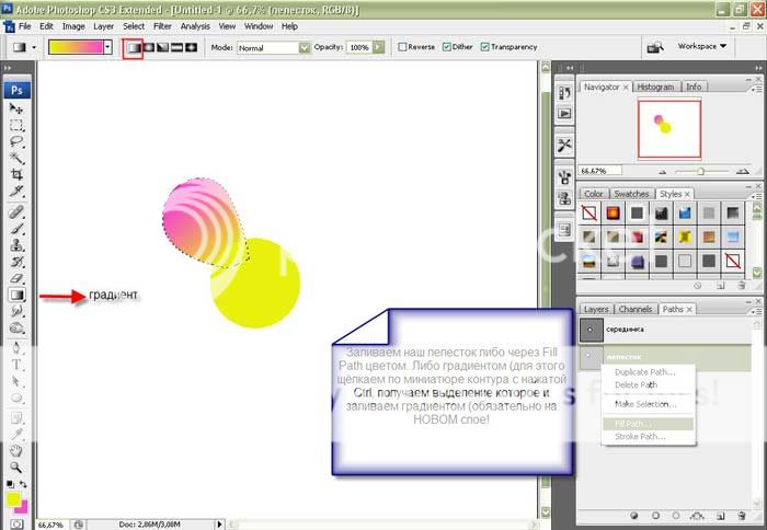 Переходим на вкладку Контуры (Path), присваиваем имя нашему контуру, и при помощи Fill Path (заливка) (вызывается из выпадающего меню если щёлкнуть по миниатюре с контуром) заливаем контур цветом. Получилась серединка цветка.