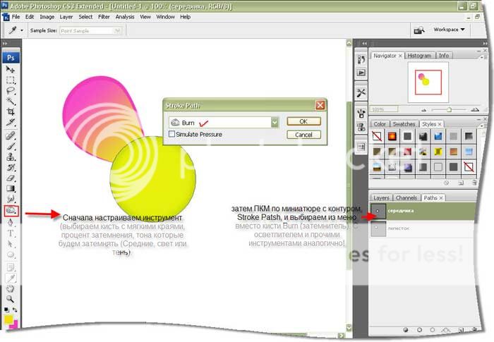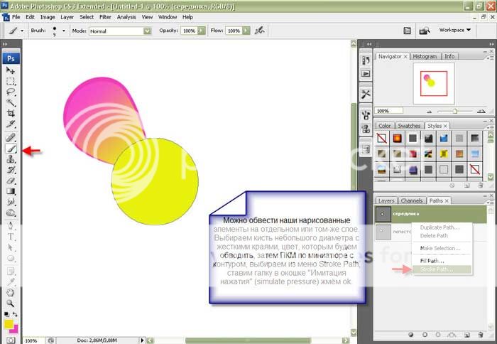 Итак, берём кисть небольшого диаметра, затем щёлкаем по миниатюре контура ПКМ, выбираем из меню Stroke Path (обводка), ставим галку в окошке Имитировать нажатие (Simulate Pressure) Получили обводку. Если результат не устраивает, отменяем действие Ctrl+Alt+Z, берем другую кисть и повторяем. Можно сначала обвести контур с имитацией нажатия кистью бОльшим диаметром, затем без имитации меньшим.