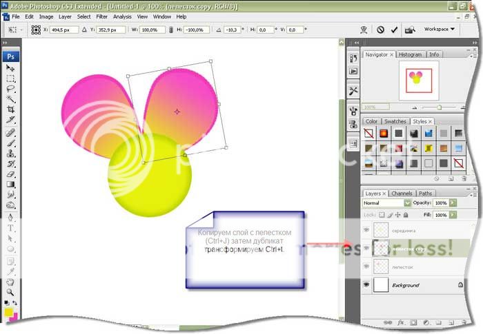 Серединка готова, лепесток тоже. Дальше включаем фантазию и делаем что хотим. Размножим лепесток (ctrl+j), затем трансформируем (ctrl+t), расположим в нужном порядке, дорисуем блики, тени и т.д. как это делать см.предыдущие уроки.