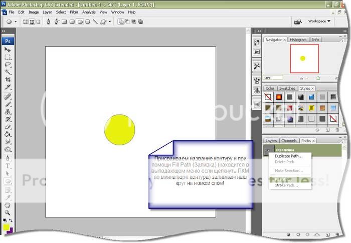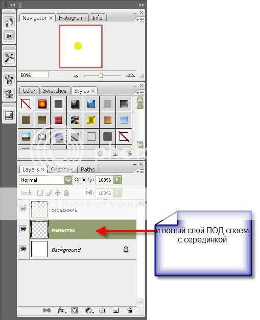 Создаем новый контур на вкладке Path, присваиваем ему имя. Создаем новый слой на вкладке слои и располагаем его подслоем с "серединкой"