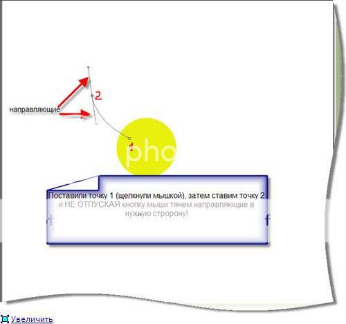 берём инструмент Pen и начинаем рисовать. Ставим точку 1 (щёлкаем мышкой в нужном месте) затем ставим точку 2 и НЕ ОТПУСКАЯ кнопку мышки тянем направляющие, пока не получим линию нужной кривизны.