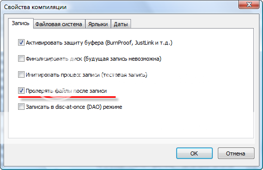В настройках я ничего почти не правила, поставила только галочку “Проверять файлы после записи”:
