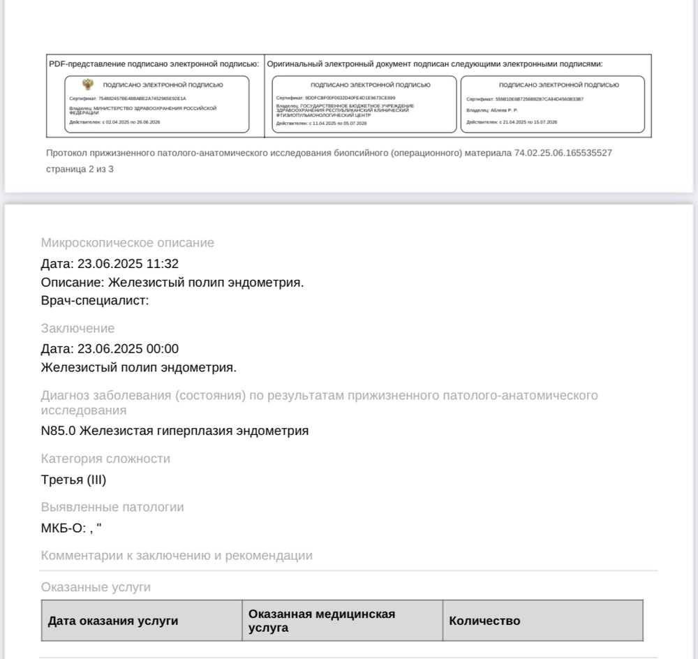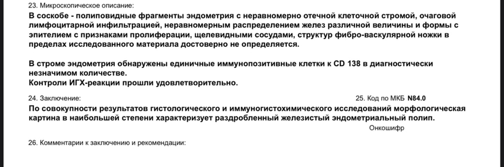 Сделали гистероскопию на 20 день цикла, врач после пришел и сказал, что в полости патологий не найдено кроме того, что устье правой трубы не нашел, еще уточнила у него что меня точно не чистили, взял только соскоб на гистологию. когда получила выписку, то в описании тоже ничего не было, потом только прочитала внизу "соскоб+полип на гистологию".