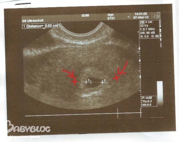 вот это черное пятно и есть эндометрий, в котором находится малыш... на моих снимках его еще не видно.. вот если мерить четко по краям черного пятна - то это внутренняя сторона эндометрия, а по её краям есть как светлая оболочка...(где я поставила красные крестики).... так вот её края это наружняя сторона... и вот по каким мерить правильно не понятно....