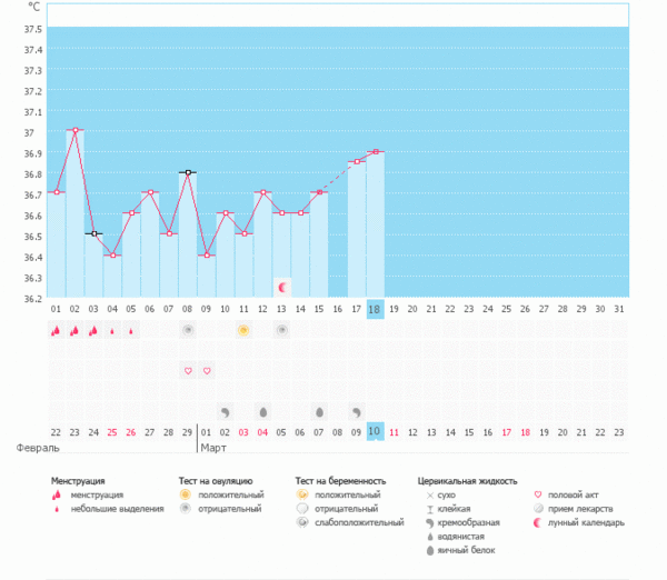 Овуляция( тесты на овуляцию)Девушки,роднулички,посмотрите мой график пожалуйста.Строю график в первый раз и ни чего не понимаю.Тест на О был полож на 11дц,но прогр. до сих пор не показывает О.Значит ее в этом цикле не было?Как вы думайте???