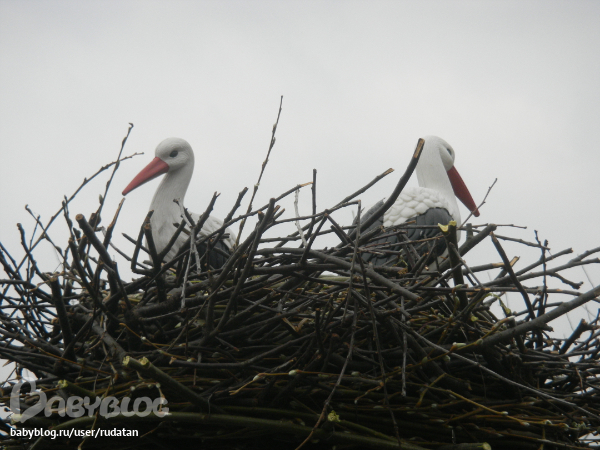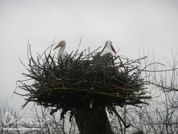 Лягухи, аисты, чихи, приметыНаконец то подарок, подаренный маме на день рождение нашел свое место. Наша срезанная яблоня, в серый скучный день преобрела вот такой вид. Гнездо делали всей семьей - муж, мама и я. Осталось преобрести еще большого аиста.