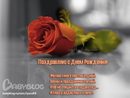 Этот день полон красок и света, Ароматов цветов и добра, Принимай же подарки, букеты В день Рожденья любви и тепла! Пусть друзья будут рядом навеки И пусть солнце ласкает лучом, Пусть текут в твоей жизни те реки, Что несут только радость в твой дом!