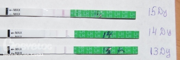 Цикл длинный у меня, 34 дня. Значит, овуляция будет день на 18-й. Сегодня 15-й день и вот какие тесты(все вечерние),(фотки со вспышкой,немного высветлены)