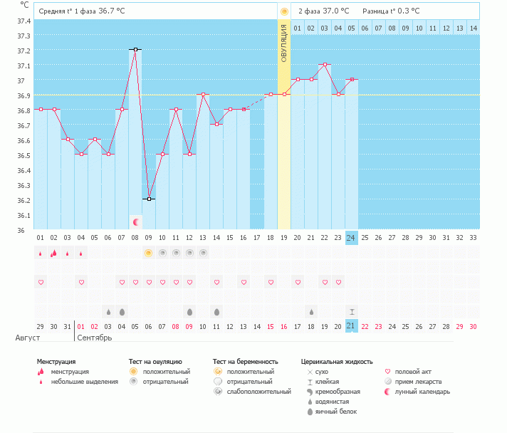 По графику очень сложно сказать. Но вторая фаза не должна превышать 16 дней. Т.е. если О была на 10ДЦ, то на 22-26 нужно ждать М или задержки. Если О на 19ДЦ, то М на 31-35 ДЦ.... Судя по длине Вашего графика О на 19 ДЦ более вероятна.
