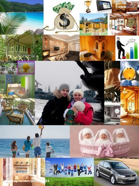 Это правда, но я неверила в это пока все не сбылось!!!!!!!Мне такой коллаж сделали девченки на работе из вырезанных картинок журналов.Они знали мои желания меня в середине сделали похожую из картинок а вокруг моего образа наклеили маленькую собачку чихуаху,длиные красивые волосы с рекламы,коляску,шубу норковую и чето еще не помню уже! !!!!!!Как только они его сделали механизм запустился мы даже и не понили сначала а потом еще возле картинок цифры ставили что за чем исполнялось!!!!Я на этот коллаж каждый рабочий день смотрела:)Первое собака-муж подарил йорка(хотя не хотел, просто сказал пошли посмотрим на этих тузиков,ну и просто без тузика не смогли уйти у нас даже денег взалог не было дать)нам ее отдали на следующий день заплатили.Наша любимая собака,муж ее называет дочей лежит рядышком и живет у нас уже 3года:)Мои короткие волосы отрасли конечно не так быстро но уже подчти до поясницы длинные густые кучерявые:))))хотя мои же девки меня ругали и все время говорили подстриги ты эти мочальны концы,я ни разу за два года не стригла и кончиков,результат на голове:))))шуба у меня уже была длинная черная а мне хотелось светленькую и коротенькую муж купил мне белую норковую коротенькую пока я была в Москве в Н Ц Кулакова готовилась к операции по поводу первичного бесплодия плюс врожденая потология по женски с детства выслал ммс я очень была рада она просто была очень дорогой для нашего кармана(если честно я ее пару раз только одевала очень жалко такую вещь даже носить:(((((моль сожрет наверно:)и самое главное для операции нужны были месячные они как назло не наступали я сделала тест и увидела свои заветные // я и муж неверили этому чуду пока не увили мой ростущий живот малявку на экране узи и сейчас ему 1 год5 месяуев.не какую операцию мне не делали только рожала изза своей потологии кесаревом, муж про коллаж не знал после всего я только сопоставила все и поняла что все сбылось только из за моих желаний и стремлений нам просто нужна установка!!!!!!!!!!!и мы все выполним есть хорошая поговорка если сильно захотеть можно в космос улететь,кстати девки на работе делали вместе с моим коллажом и еще один для другой девочки но она ни чего не хотела тольео свое жилье они ей и наклеили два дома не поверите она купила себе двух комнатную квартиру,извените что на строчила я просто во все верю не бывает ничего просто так!!!!!Сейчас я ужасно хочу вторую БЕРЕМЕННОСТЬ ия уже сама сделала себе коллаж там я с мужем а вокруг все что может быть о беремености животик детки снимки узи беременные девушки надписи жизнь пополнение моя радость родители мама это я стать папой все из журналов еоторые брала еогда сынулей была беремена и приклеила туда своц первый завтный тест с // !!!!Всем удачи и исполнения всех мечт!!!!!!!!!!!Все сбудиться главное верить и идти к этому не смотря ни начто! !!