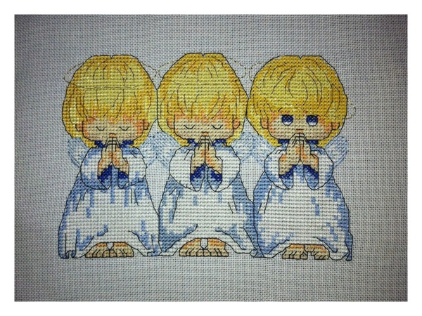 вышивала по бесплатной схеме из интернета, цвета подбирала из того, что было дома в наличии, ну и напортачила порядком (особенно второй ангелочек пострадал))), так что они у меня все трое почти идеальные)))) зато теперь они у меня есть) и я их люблю)))