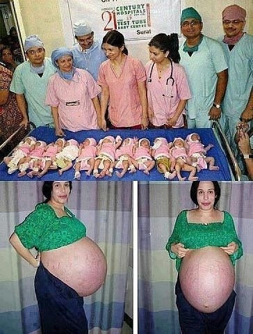 это утка была такая чтоб ей родить столько дитев надо чтоб они весили максимум по 200гр потому как еще воды и плацента а такие дети как правило не выживают , у нас в роддоме баба была с таким же пузом родила 2х по 3 кило так что это утка ))