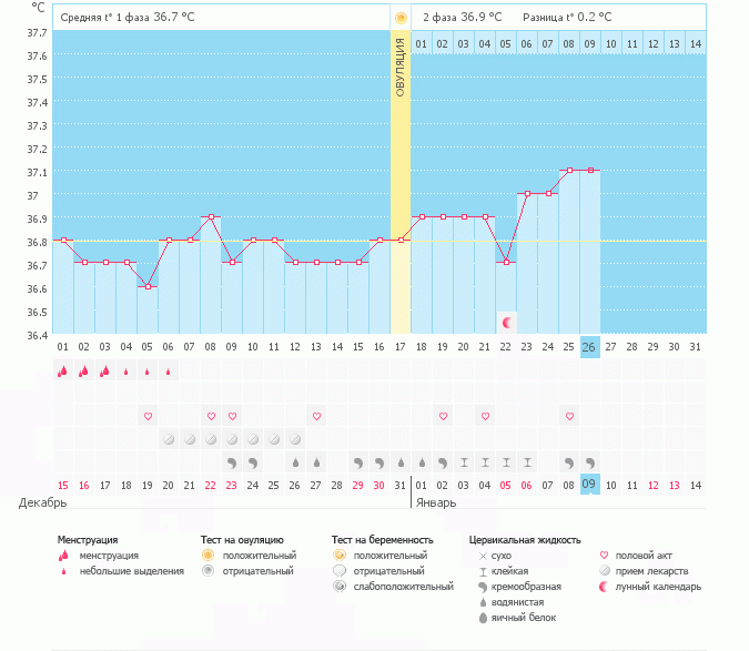 ну вы сами посмотрите, у Вас в первой фазе 36,7 среднийй показатель( 4 дня было), а 2-ая фаза 4-ре дня было 36,9, если дай бог будет дальше держать 37 и выше он вам и выдаст большую разницу!!! Удачи Вам!!!@@@@@