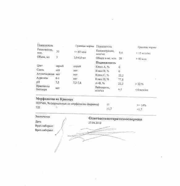 Посмотрела СГ ниже - вам надо ещё морфологию по Крюгеру сделать - посмотреть, сколько патологических форм. Подвижных у вас, получается, нет, хотя стоит 22,2, но это С - а С - это поступательное движение - по кругу бегают, грубо говоря... Пересдайте через пару недель, и в той лабаротории, где делают морфологию строгую.