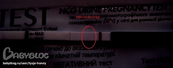 ).Сегодня не вытерпела и сделала тест - делала еви, другого более чувствительного не было.На мое удивление появилась слабая но полосочка.Даже муж-скептик ее увидел.Животик тянет чуток.По вечерам появилась тошнта.