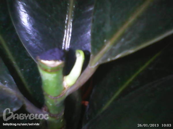 Лягухи, аисты, чихи, приметыВ декабре перед новым годом я решила купить себе орхидею и антуриум.И вот в магазине увидела фикус с отломленной верхужкой и мне его так стало жалко ну и решила купить и его(муж со свекровью отговаривали сказав что он не выживет,т.к верхужка у него подгнивала),привезя его домой я срезала ему подгнившую верхужку начала за ним ухаживать и вот с пустя 3-и недель он меня обрадовал отросточком.