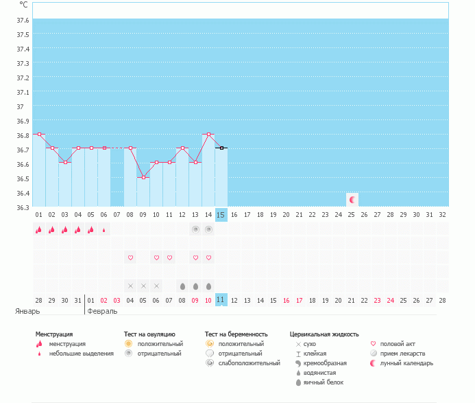 график выше, сегодня перед тем как померить села, пришлось сыну помочь к нам в кровать залезть, чего о там ему приснилось,и померила получается на 15мин раньше положеного,поэтому поставила галочку не учитывать,была 36,7... а вообще средняя 36,67 ...... да я чего то расстроилась совсем,реву целый день сегодня, мне кажется и этот цикл пролетели мы, поясница ещё чего то ноет....