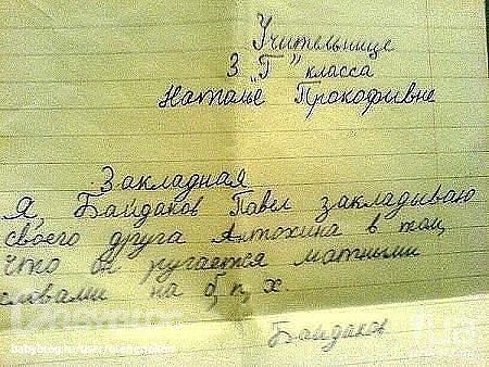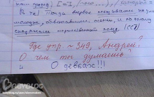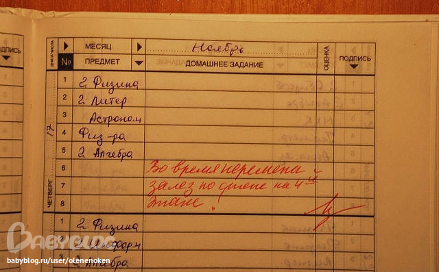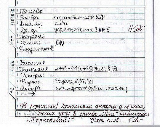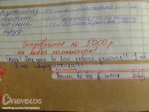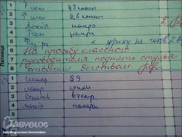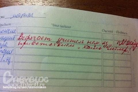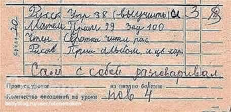 а еще мне нравились записи типа "читает реп на музые"(ребенок репом увлекается),"на уроке труда что то мастерил" и "разбил нос ....... за то,что .... ударил вашего сына" учителя тоже отжигать умеют!))))))))))