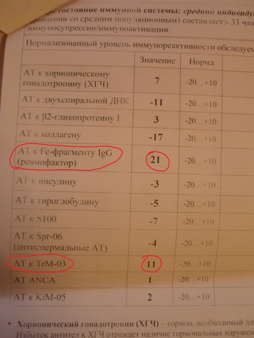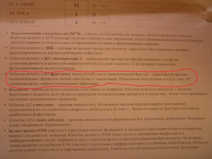 вижу завышенный результат антитела к Fc-Фрагменту LgG. И написано, что избыток иммуноглобулинов (ревматоидный фактор)- характерный признак воспалительных процессов любой этиологии и локализации. Избыточное поступление к плоду этих АТ сопровождается эмбриотоксическими эффектами.