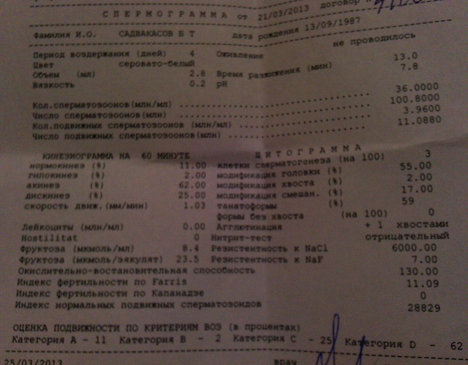 Ну, смотрите: категория А - активноподвижных в норме должно быть от 25% и выше, у вас 11%. А кат. D - не подвижных, у вас 62%. + C (с не поступат. Движением) 25%. Это не есть гуд. Нужно к андрологу!