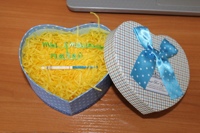 Первый раз я сказала, что как-то странно на запахи реагирую и соски тааакие большие стали:) Потом дома два теста сделала - положительные, звоню ему говорю, что бы ещё 2 купил. В общем не романтично. В этот раз купила пустышку розовую, и тест плпншетный красивый - все в коробочку положила. И вручила подарок во время ужина.