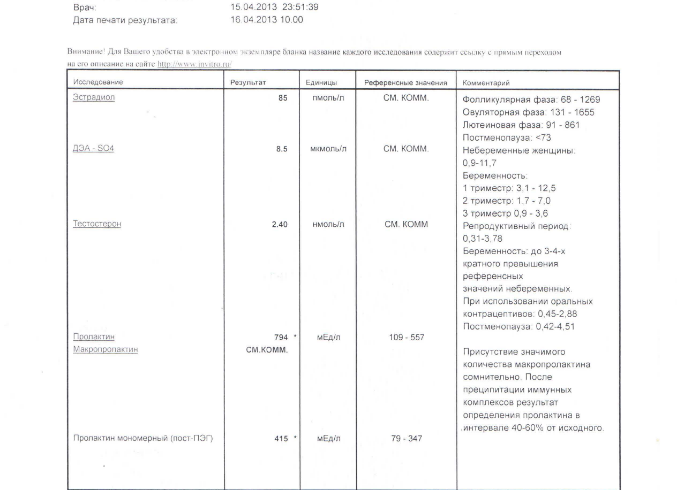 АнализыПосле всех моих лечений, решила посдавать анализы, инфекций не обнаружено, мазок вроде нормуль, а вот гормоны сцуко (даже не знаю как их уже обозвать) опять шалят, пролактин опять завышен, это мы с Гиней решили отменить достинекс, который я пропила 10 месяцев, и вот что в итоге, опять высокий пролактин! Это ж что получается, вечно мне сидеть на этом достинекксе что ли? Эх сил моих больше нет....