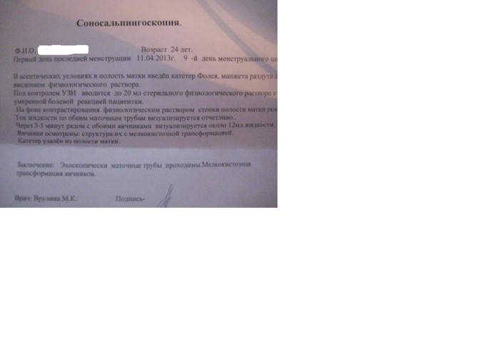 в результате я не пошла написала отказ.......дальше поехала в нижний на эхогсг с помощью узи думаю менее болезнее и укол не такой....короче захожу..делают укол кетанол в попу и все в маткку укола некакого вроде не было....спиртом вроде не мазали там....сажусь на геникологическое кресло она мне вставила зеркало..я даже не почуствовала,потом вставила кататер..типо трубки пласмассовой ..и чето сделала что мне стало больно...я говорю вы уже заливаете жидкость?говорит нет еще....дальше прикол...надо было встать и перейти в другой кабинет там узи....нормально мне и так больно..ну ладно между ног тряпочку и иду держу....легла..начали пускать водичку или че там на узи пускают...вот тут было больновато...потом еще больнее и еще больнее...я говорю больше ненадо я не выдержу...она все..все ..все....начала смотреть по узи с лева видишь говрит водичка течет вниз струйкой говорю да...вот это говрит трубы проходимы и с право тоже показала....потом говорит сколько там залили та говрит не помню щас сколько...говрит довай еще чуть чуть...начала еще пускать...я кричу ненадо больше...боль скажу у меня по крайней мере было не как месячные не тянуло а боль прям тянет и болит низ живота....она все перестала...в резульатте ОБЕ ПРОХОДИМЫ!!!!!!!УРААААА!!!!!!!!только вот интерестно почему она не вытекает у меня ??ОО...или так должно быть?куда же она делась вся???я одела конечно прокладку но там щас домой приехала чуть чуть крови есть......и вот заключение....и еще девочки скажите мне терь ненадо на гсг????Р.С выписала мне свечки макмирор комплекс 8 свечей 450 рублей