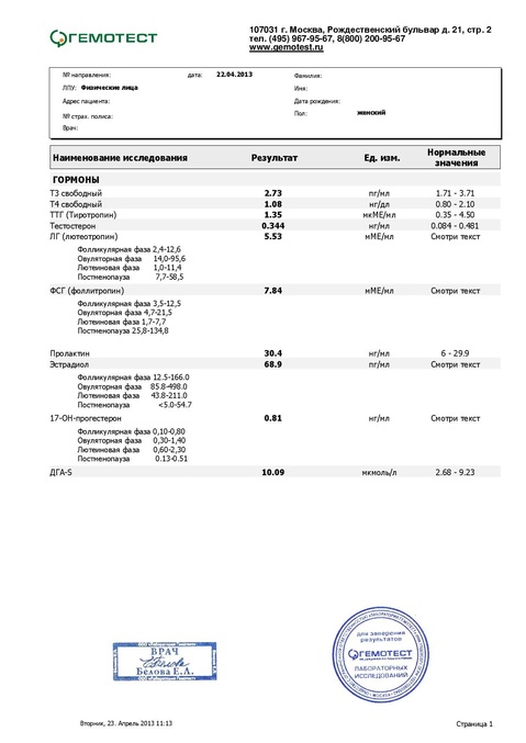 Дальше, незначительное превышение 17 ОПГ и ДГА-S ровным счетом ничего не говорит! Вы зачем сдавали вообще гормоны?