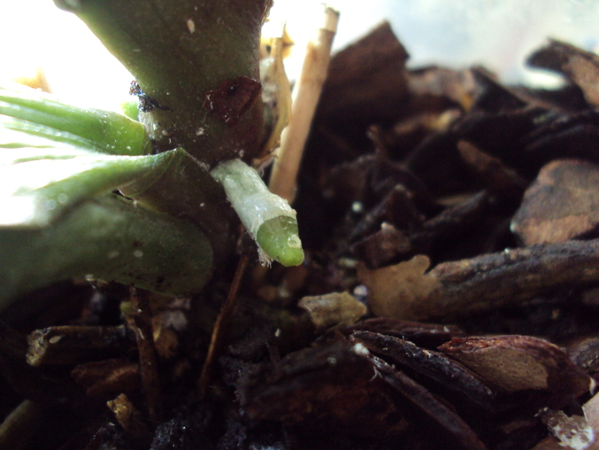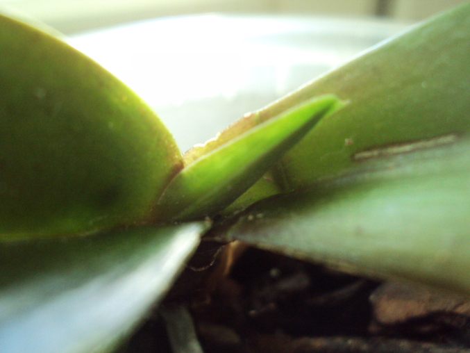 Новый корешок и новый листочек. Откуда они на почти умершем цветке, у которого все корни превратились в труху? Вот загадка!