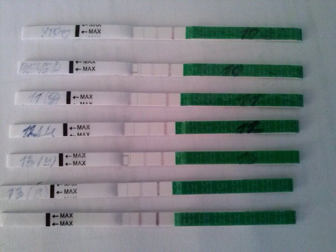 Овуляция( тесты на овуляцию)Девочки посмотри пожалуйста пришла Овуляция? мне почему то кажется что пришла, последний тест это сегодня утром на 14ДЦ(утро), просто на них подписывать не получается..... Тестик кстати Евик.Вчера вечером кстати яичник слева ОЧЕНЬ болел! Кто скажет? я в сомнении ..... первый раз отслеживала