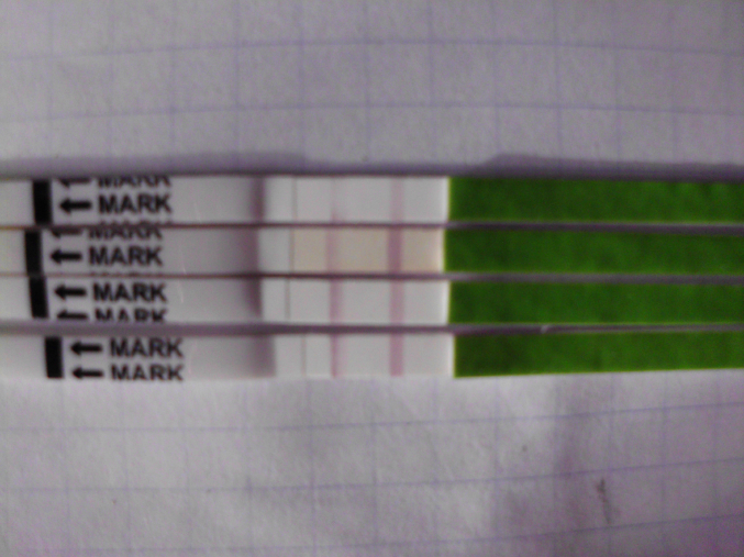 Девчёнки , можно ли считать этот тест на О положительным, просто там полоска какая то странная , сбоку яркая , а так , в целом, как будто и не яркая совсем. Я запуталась. Выкладываю его, посмотрите. А ниже картина в целом, в общем, мне кажется, предыдущий положительный, а последний послабее.