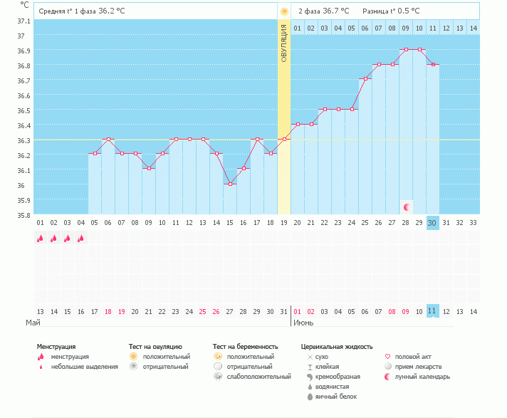у вас разница фаз 0,5... очень даже обнадеживает. в месячные лучше не вписывать температуру, она портит график только и не информативна.