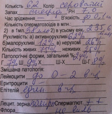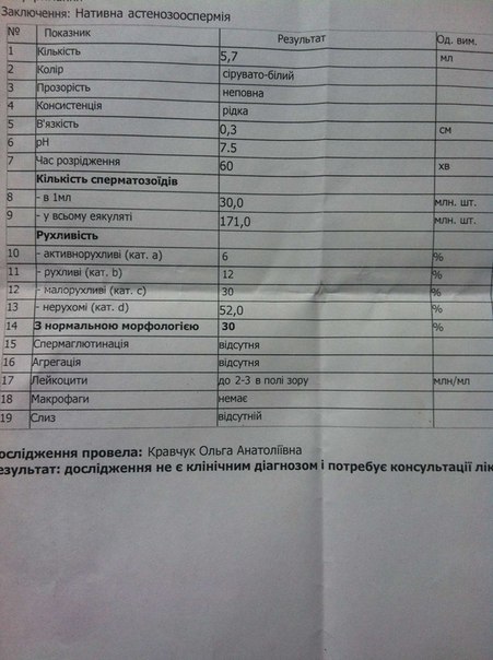 За этот месяц муж повторно сдал спермограмму, мы записались к врачу, которого советовала мой гинегоколог. Что имеем в итоге? Все инфекции отрицательно (уреаплазмы, микоплазмы, хламидии и т.д), спермограмма в гос. клинике по подвижности сперматозоидов очень отличается от той, что в Мать и Дитя. Врач вечно деловой и ничего толком не может объяснить что делать дальше - какие таблетки, процедуры нужно проходит. Я понимаю, что наши проблемы врачам не очень то важны, но просто убивает такой подход. Единственное, что сказал пить L-карнитин. Что вы советуете? какие анализы еще нужно сдать? Возможно, знаете хорошего, проверенного врача, которого хоть немного интересуют пациенты - мы ведь не бесплатно туда ходим. Спасибо большое