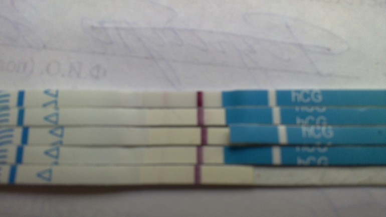 Мне кажется, что полосочка ярчает у тебя (на нижнем она ярче, чем на предпоследнем), а на верхних - от укола ХГЧ, наверное, полосочки.