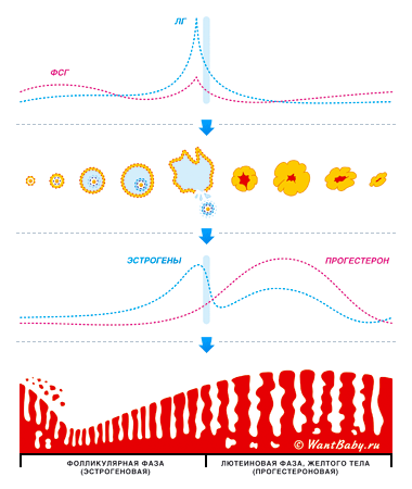 Судя по этому рисунку, 12-24 часа следует считать с момента выброса ЛГ, т.е. с момента тех самых // на тесте на О. В этот момент яйцеклетка выходит из яичника и движется навстречу спермикам. Эстроген идет на спад, а прогик начинает повышаться.